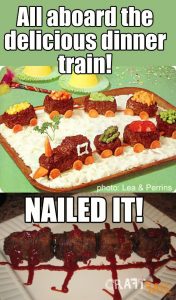 All aboard! I hope the kids don’t get motion sickness: I have a feeling there will be enough nausea on this trip already. Someone top this meatloaf train, I wanna get off.